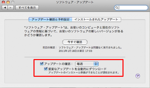 (3)「アップデート確認と予約設定」のタブを選択します。 「アップデートの確認」、「アップデートを自動的にダウンロード」にチェックを入れます。最後にこのウィンドウを閉じます。