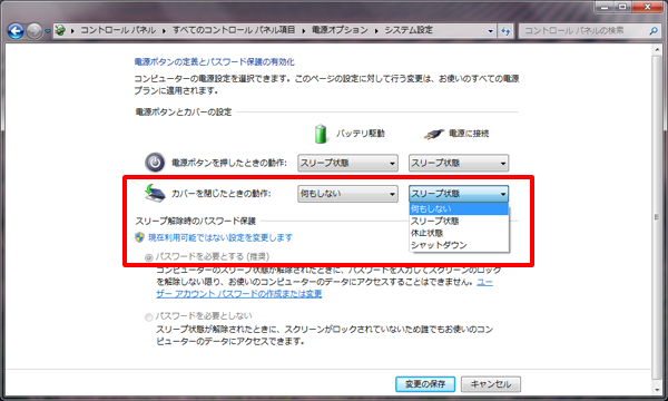 (3)「カバーを閉じたときの動作」欄の「バッテリ駆動」と「電源に接続」の両項目を、「何もしない」に設定します。