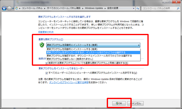(3)「重要な更新プログラム」から「更新プログラムをダウンロードするが、インストールを行うかどうかは選択する」を選択し、「OK」をクリックします。