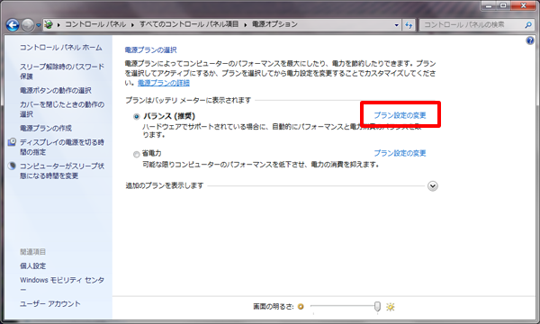 (2)「バランス(推奨)にチェックを付けて「プランの設定の変更」をクリックします。