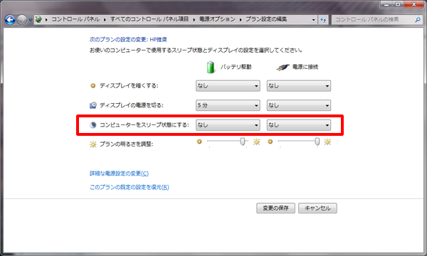 (3)「コンピューターをスリープ状態にする」を「なし」に変更します。